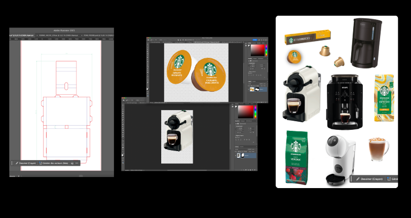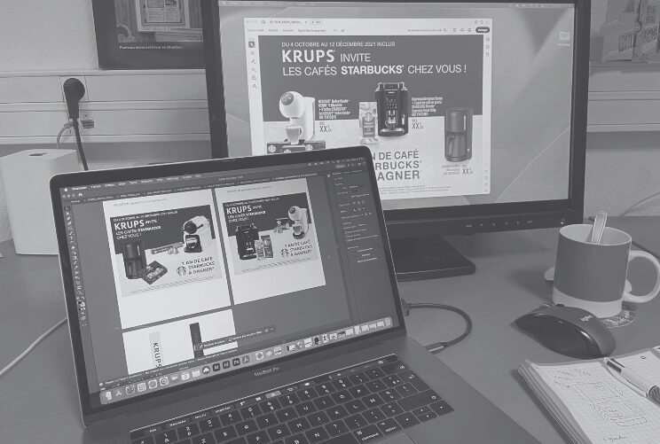 À travers des sujets et des marques très variées (Nescafé, Krups, Apple…), j’ai eu l’occasion d’utiliser les sites de création comme Photoshop, Indesign, Adobe Illustrator ou encore After Effects et Figma.